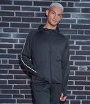 100% polyester french terry. Slim fit. Funnel neck hood with toggles. Full length zip with chin guard and inner zip guard. Raglan sleeves with reflective tape. Two front zip pockets. Inner media pocket. Thumbholes on cuffs. Self fabric bound hem. Flatlock stitching.