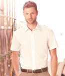 Easy care fabric. Semi-cut away boned collar. Double folded seams. Plain back yoke. Curved hem.